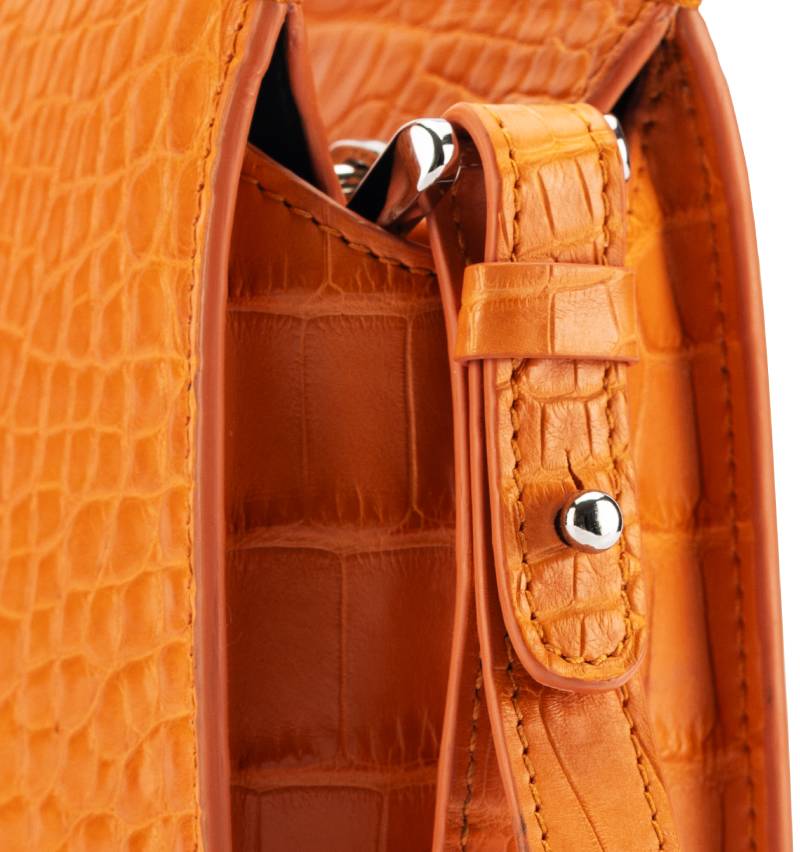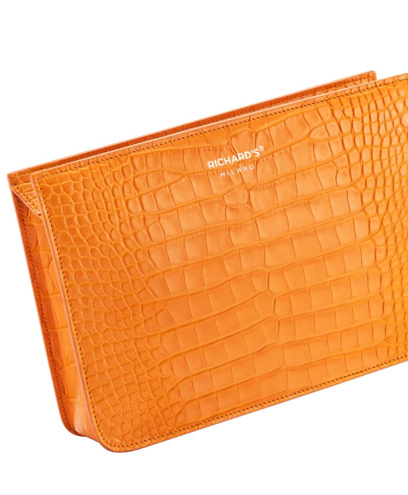 Its silhouette is defined by matte orange American alligator, selected for its depth of texture and natural character. The clean envelope construction is reinforced by a steel closure that sharpens the line without interrupting its essential form.
